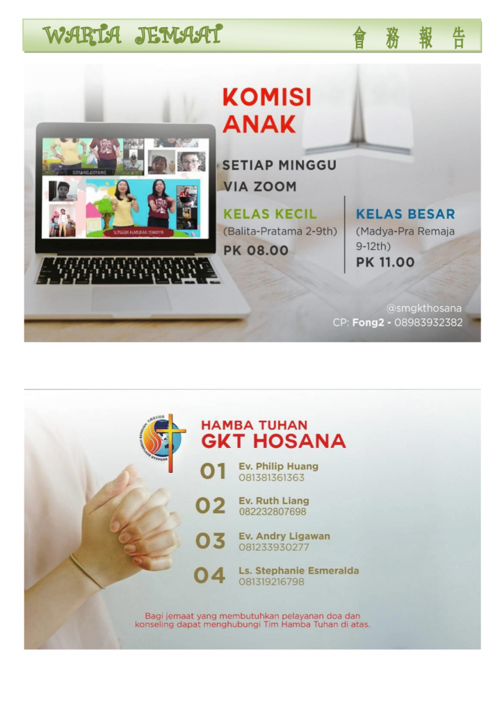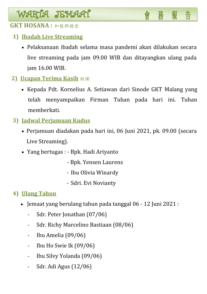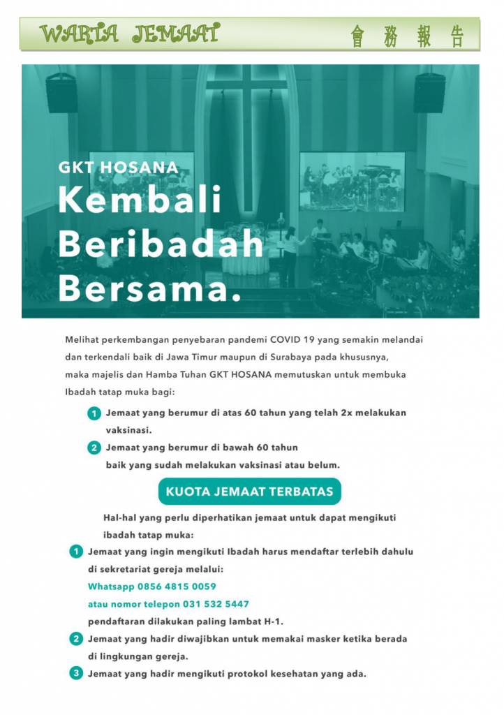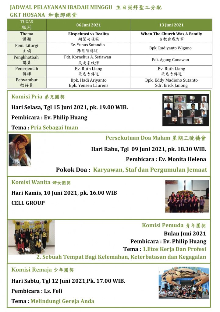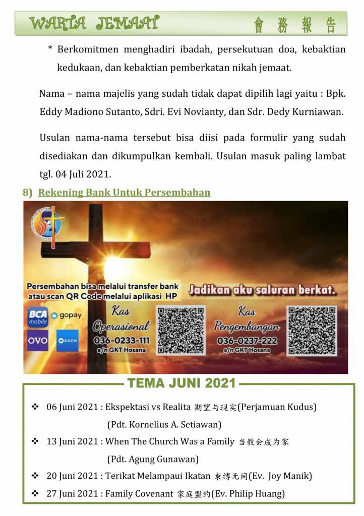 Warta Gereja Tahun 2021 Warta GKT Hosana, 6 Juni 2021. 4 June 2021 Continue Reading Previous Warta GKT Hosana, 30 Mei 2021.Next Warta GKT Hosana, 13 Juni 2021.